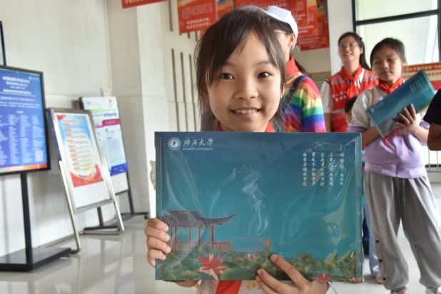 同学们来到广西大学,跟着志愿者“学姐”一起步行游览校园。在育才广场,听学姐讲解“梧州建校—桂林兴校—西迁榕江—南宁复校”的历史,巨幅时光轴和记录学校历史重大事件的浮雕等深深吸引了同学们,纷纷驻足拍照留念。
