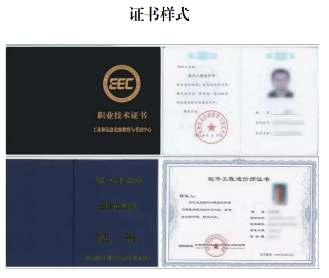 通过考试的学员,将获得工业和信息化部教育与考试中心和北京软件造价评估技术创新联盟分别颁发的《软件工程造价师证书》。(详见附件2:证书样式)