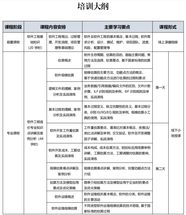 软件工程造价师培训课程由北京软件造价评估技术创新联盟依据国家标准GB/T 36964《软件工程 软件开发成本度量规范》、GB/T 28827.7-2022《信息技术服务 运行维护 第7部分:成本度量规范》相关内容组织开发。课程系统阐述了如何基于行业成本估算模型对软件项目的功能点规模、工作量、工期、成本进行合理估算,并进行实战演练。(详见附件1:培训大纲)