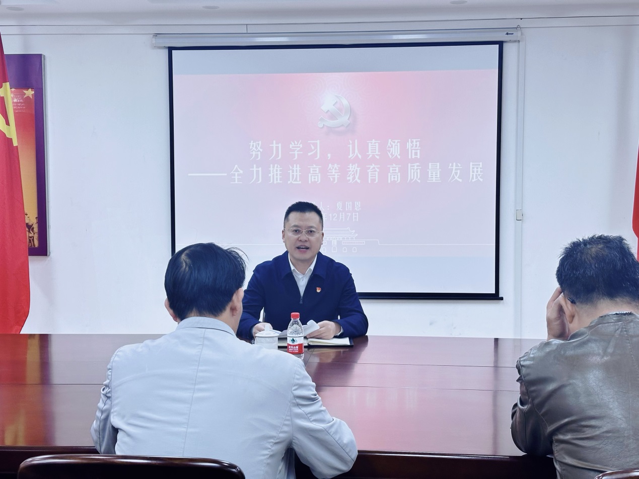 2023年12月7日,校党委常委、副校长夏国恩到继续教育学院党支部以《努力学习,认真领悟---全力推进高等教育高质量发展》为主题,在学院206会议室为全体支部党员讲授专题党课。