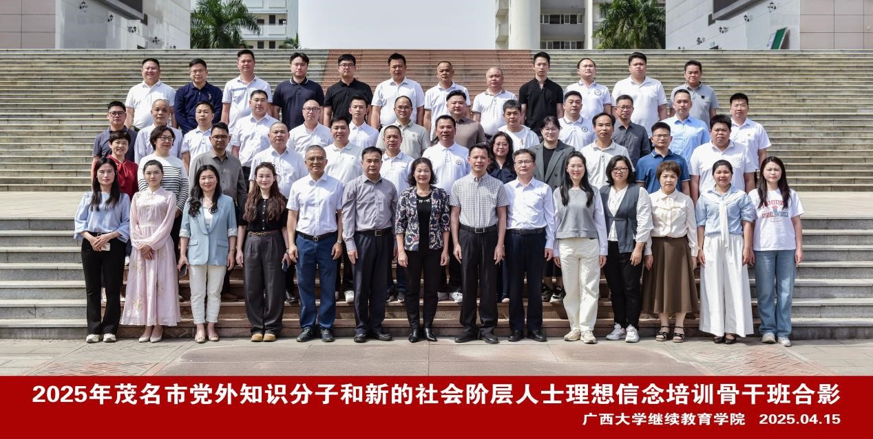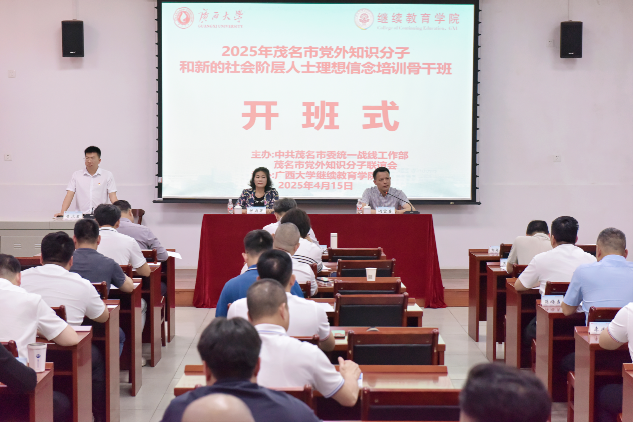 2025年4月15日,2025年茂名市党外知识分子和新的社会阶层人士理想信念培训骨干班在我校开班,茂名市委统战部二级调研员邹肖萍、马博电子院长闭富春出席开班式。