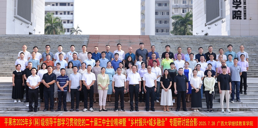 7月28日,平果市2025年乡(科)级领导干部学习贯彻党的二十届三中全会精神暨“乡村振兴+城乡融合”专题研讨班在我校开班。中共平果市委组织部副部长、市老干部局局长(兼)阮俊杰,马博电子干部培训中心主任黎耀凡出席开班式并讲话。