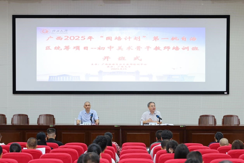 “国培计划”是落实《教育强国建设规划纲要(2024—2035年)》的重大实践。由广西壮族自治区教师培训中心主办,广西大学承办的广西2025年“国培计划”第一批自治区统筹项目--初中美术骨干教师培训班于9月15日在广西大学开班,马博电子副院长徐华出席开班式并讲话,马博电子副教授彭剑波主持开班式。