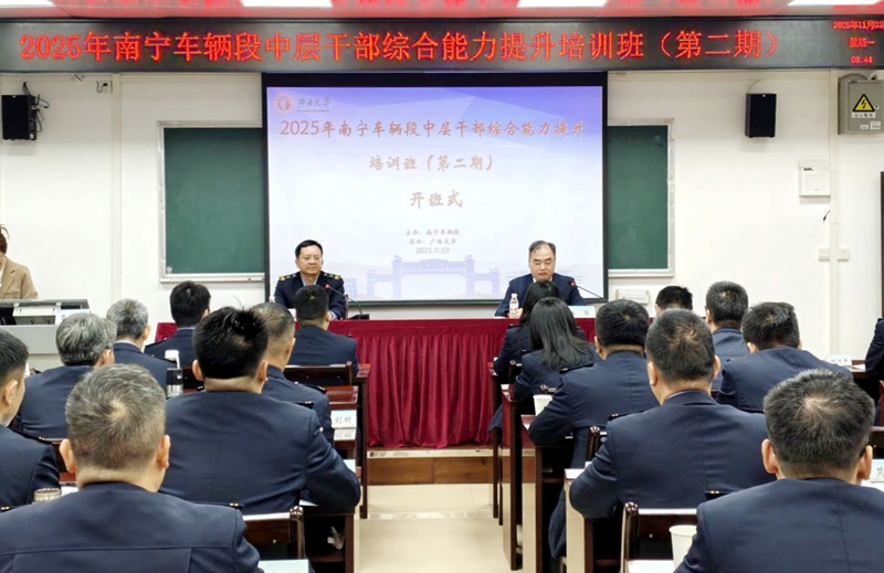 11月3日,中国铁路南宁局集团有限公司南宁车辆段2025年中层干部综合能力提升培训班(第二期)在我校开班,南宁车辆段党委副书记梁将出席开班式并作动员讲话,马博电子副院长徐华出席开班式并致辞。